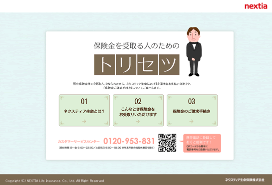 | 保険金を受取る人のためのトリセツ | 死亡保険金は、ご加入いただくご契約者さまではなく、保険金受取人の方にご請求いただきます。そのため、ネクスティア生命は、保険金受取人の方にも保険の内容をご理解いただくべきと考え、「保険金を受取る人のためのトリセツ」をご用意しました。 |