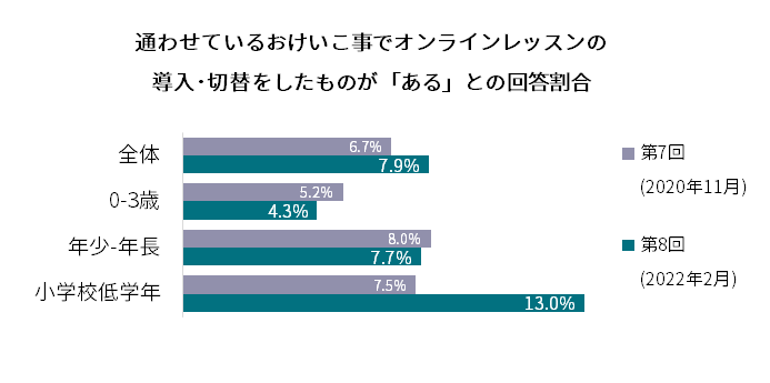 ● 通わせているおけいこ事でオンラインレッスンの導入・切替をしたことがあるか質問したところ、「ある」との回答は前回調査(2020年11月)から1.2ポイント増加し7.9%となりました。特に小学校低学年は13.0%と全体平均を上回り、前回調査の7.5%からも2倍弱の増加となりました。